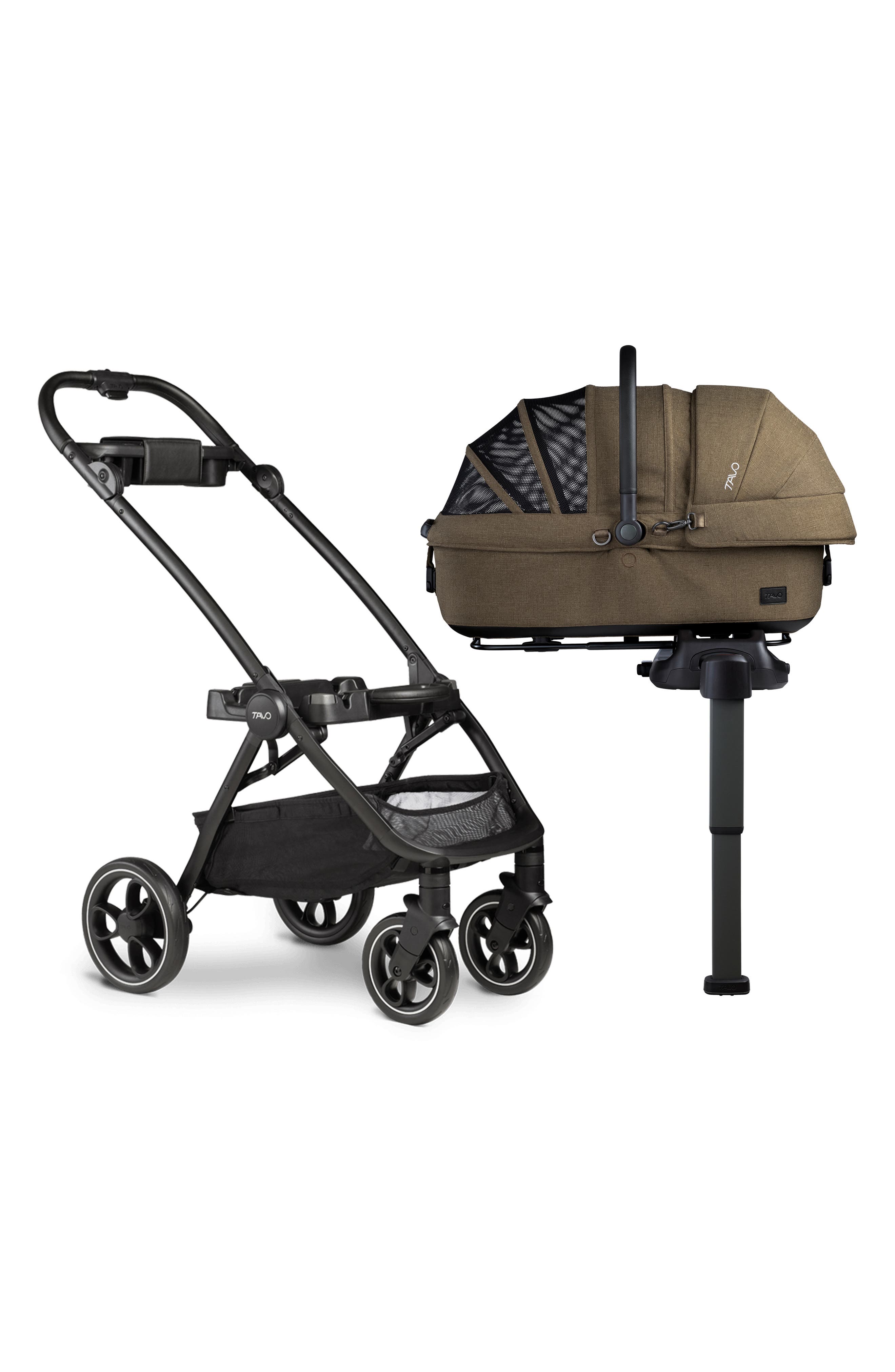 A complete travel set for your furry BFF to enjoy a safe space at home and on the go includes the Maeve Flex car seat and base along with the Roscoe stroller.Why pet parents will love it: Keep your pet safe while on the go in this secure pet car seat designed with side-impact protection and a sturdy base for your vehicle to keep the ride smooth and ease travel anxiety for your pet. The carrier simply clicks and locks into the base and features a simple release button. The base is easy to adjust and can adapt to the depth of your vehicle's seats. The durable mattress cover and interior fabric match the color of the carrier. It is treated with an ink-based technology that provides antimicrobial protection and guards against odor-causing bacteria. The included Roscoe stroller features a large basket, push-bar organizer, cupholder and a shoe-saving one-touch brake. The engineered frame is strong and stable around every bend in the road. A front-wheel swivel-lock makes for easier navigation over rough paths.Why pets will love it: The carrier gives your pet a safe, familiar space to curl up wherever they are. It is designed with a comfortable pod and structural UPF sun canopy to create a cozy space. Mesh ventilation panels allow for airflow and a view of the world around them, and rubberized feet keep the carrier steady as your pet jumps in and out. A connected leash keeps your pet safe while on the go with the canopy open. The carrier comes with a plush mattress and two mattress covers that are machine washable. The stroller's multiterrain suspension accommodates bumps wherever your stroll takes you.Pet weight/height: Up to 30 lb.Car seat weight/dimensions: 14.1 lb. complete carrier, canopy and SIP guard; 12.5 lb. base; 33.1"L x 23.2"H x 18.4"W carrier.Stroller weight/dimensions: 15.5 lb., 35.5"L x 42.6"H x 20.7"W unfolded; 13.4"L x 25"H x 20.7"W folded.Fold: One-hand, compact fold. Stands when folded for free hands and easy storage.Tires: Puncture-proof, lightweight rubber tires provide a soft ride.Safety features: MagneTech secure snap buckles secures the canopy; lightweight yet durable EPP foam surrounds your pet, absorbs energy, and disperses impact.A Side Impact Protection (SIP) guard secures easily onto the pet car seat frame and features Tailor tech™ memory foam; rubberized feet minimize movement; five-second True Lock Installation; stability leg decreases rotation and reduces movement of the pet car seat; indicator turns green when properly engaged.Car seat compatibility: Includes Maeve Medium Rigid pet car seat and base (no adapters required). Includes Maeve pet car seat with canopy, two mattress pads, one comfort liner and mattress cover set, one durable liner and mattress cover set, one short carrier leash, one long carrier leash, Maeve™ Vehicle base and Roscoe stroller Bottom stroller basket holds up to 10 lb. Car seat is steel/aluminum/polyester/plastic/rigid foam/polyurethane; stroller is steel/aluminum/polyester/plastic/rubber Imported